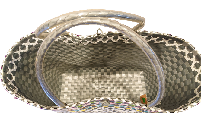 梱包資材のPPバンドを編み込んで作り、軽量で丈夫で、水にも強いバッグです。