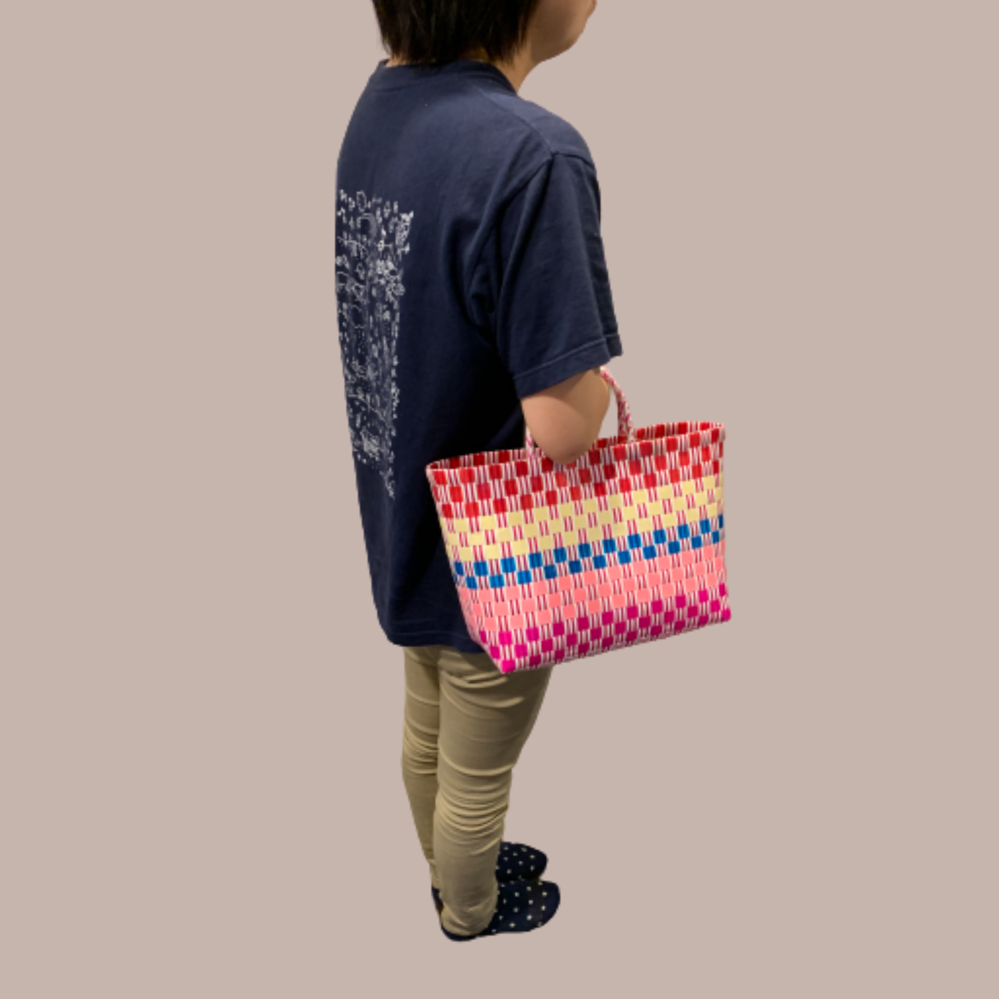 梱包資材のPPバンドを編み込んで作り、軽量で丈夫で、水にも強いバッグです。