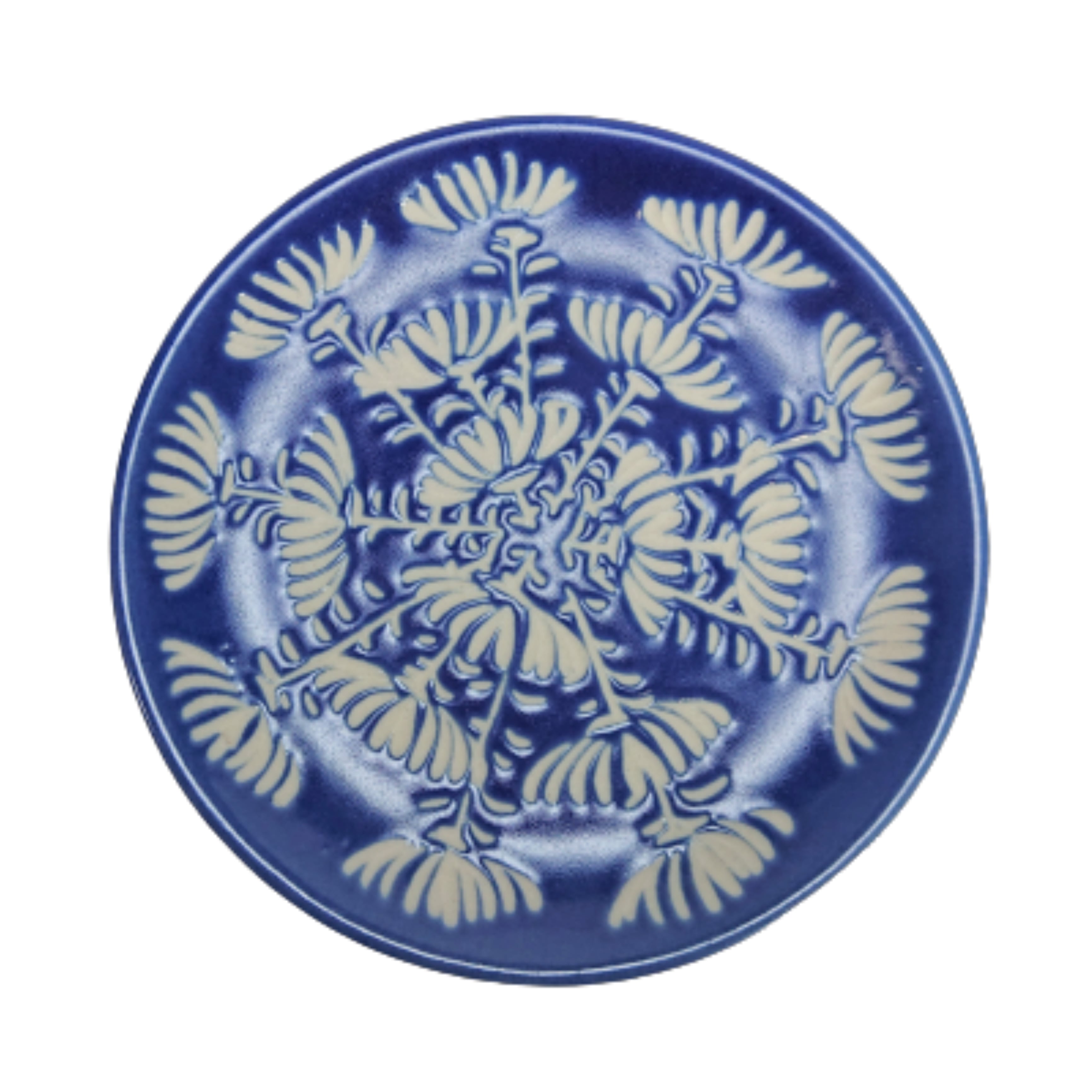 ベトナムブルーの深みのある青色に手彫りで彫られた菊の花が素敵なデザインのバッチャン焼きです。
