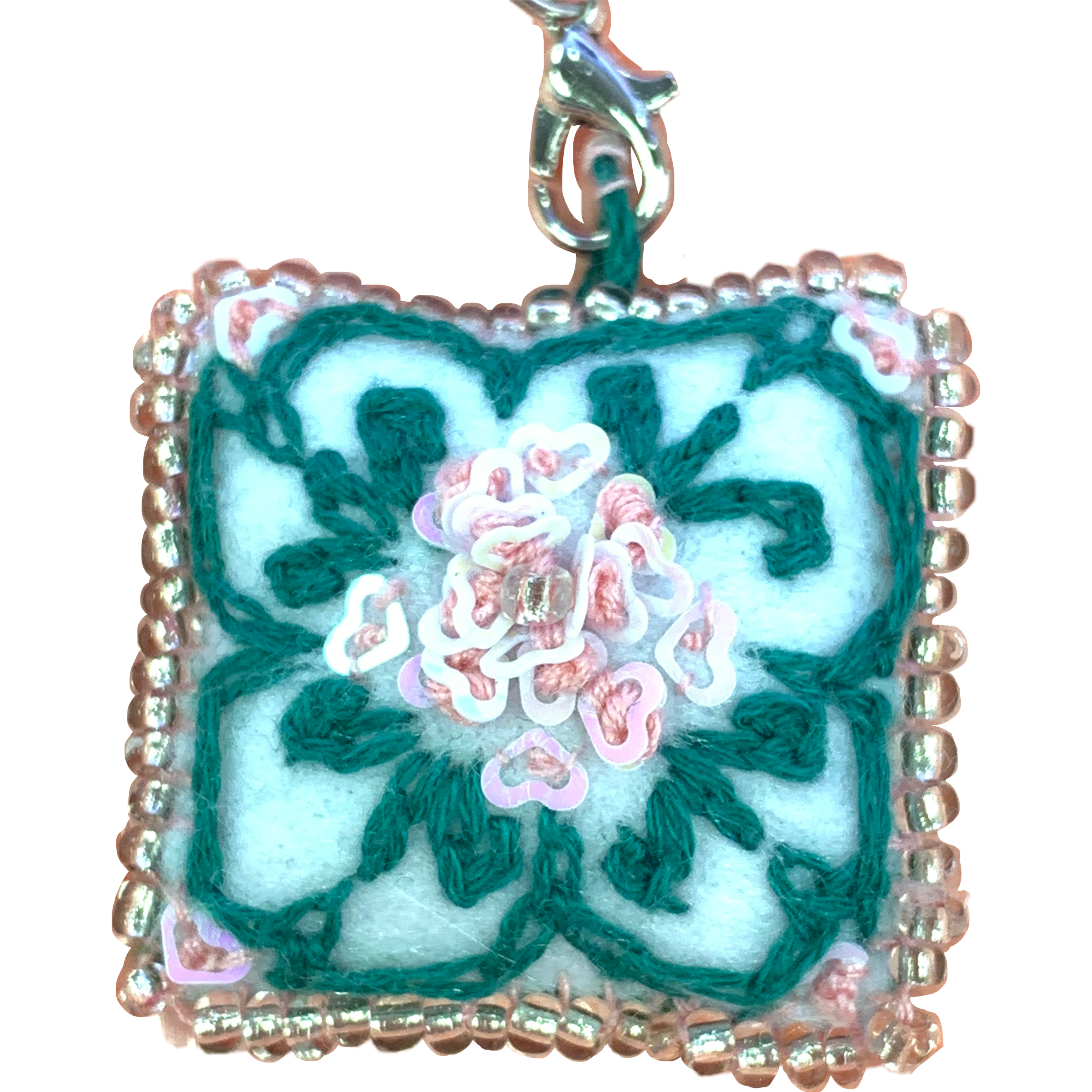 グリーンの刺繍とパールピンクのハートの組み合わせが可愛いと思いながら作りました。