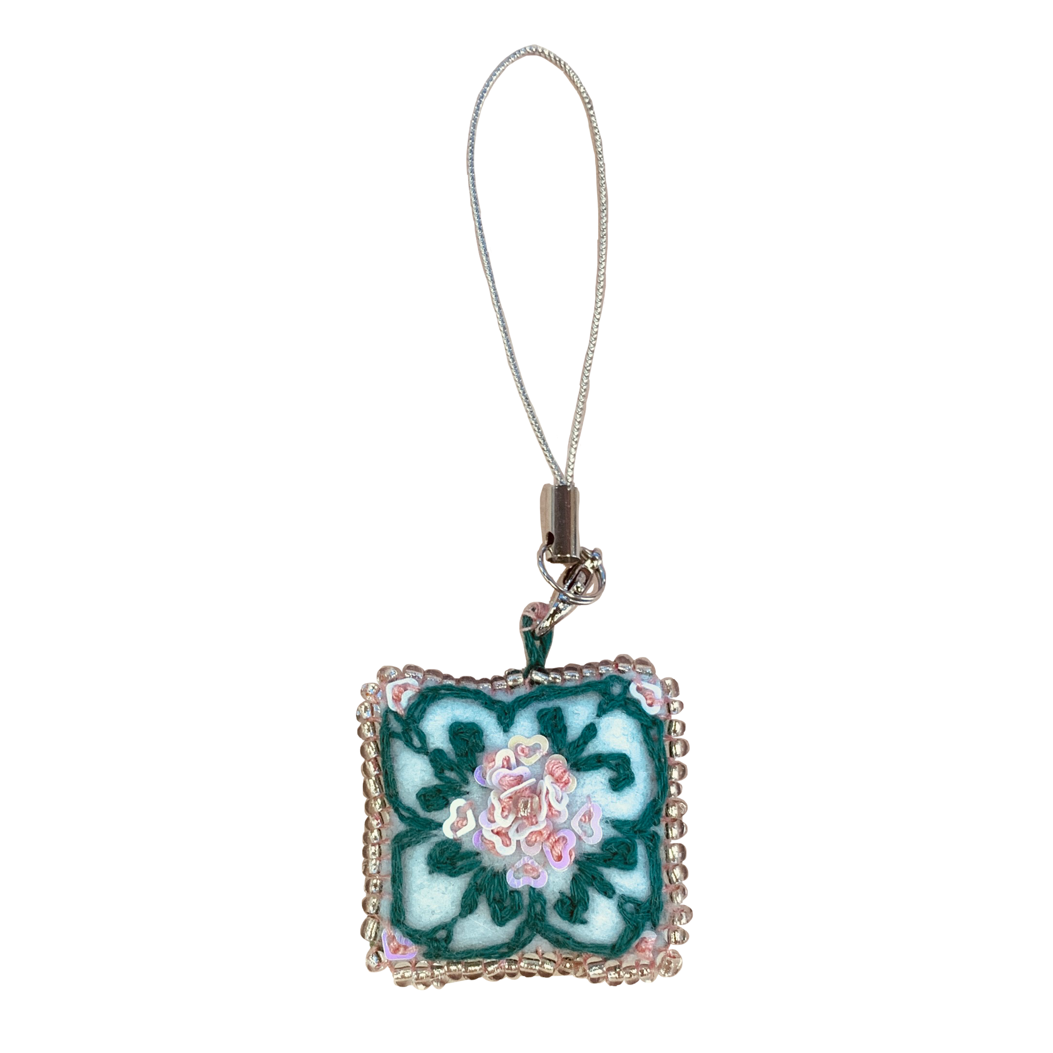 ビーズと刺繍で飾ったキラキラでかわいいストラップです。