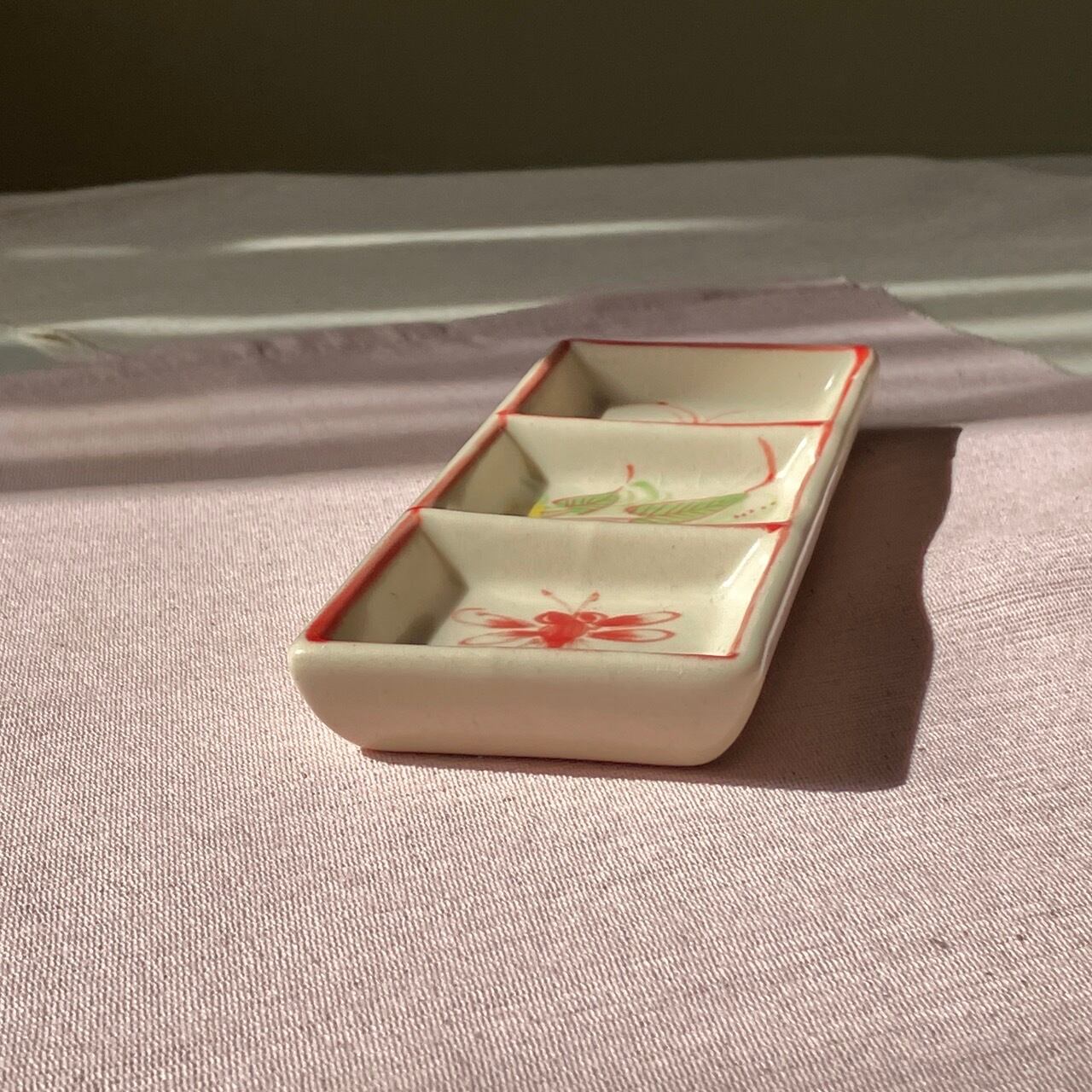 バッチャン焼き 三連皿 小鉢 とんぼ 2匹 赤 オールド柄 ベトナム雑貨