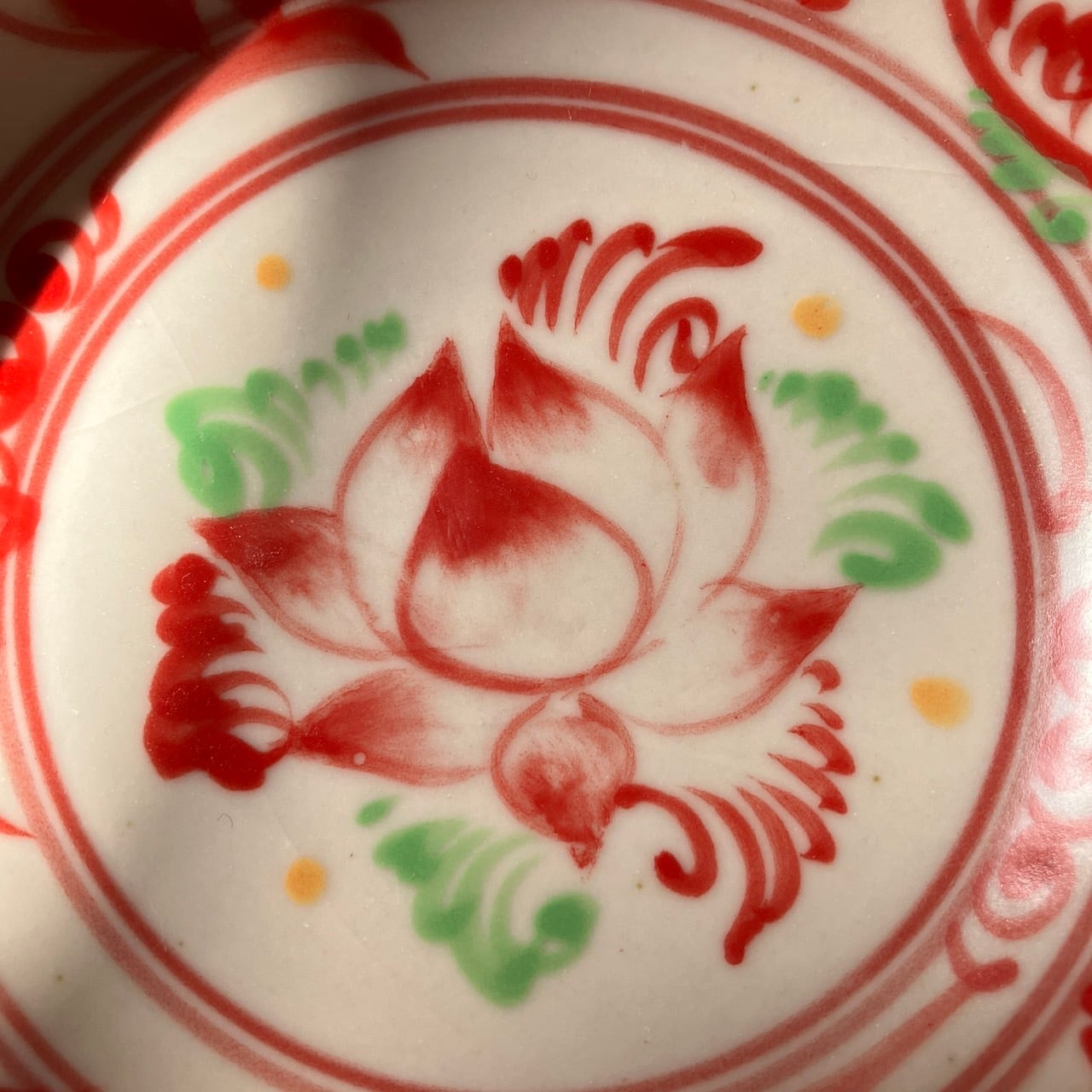 定番の赤い蓮が描かれているデザインと使いやすいサイズのお椀です。