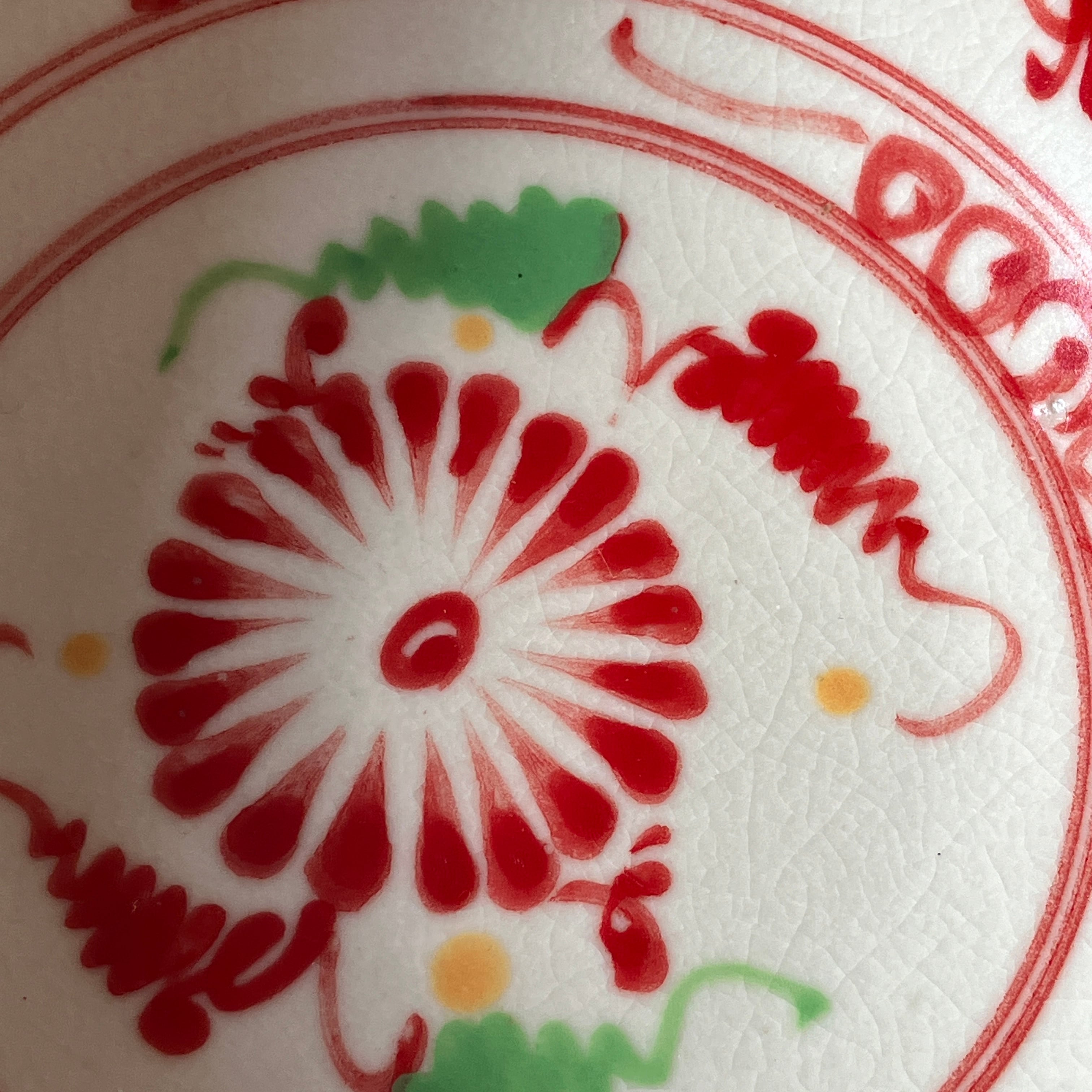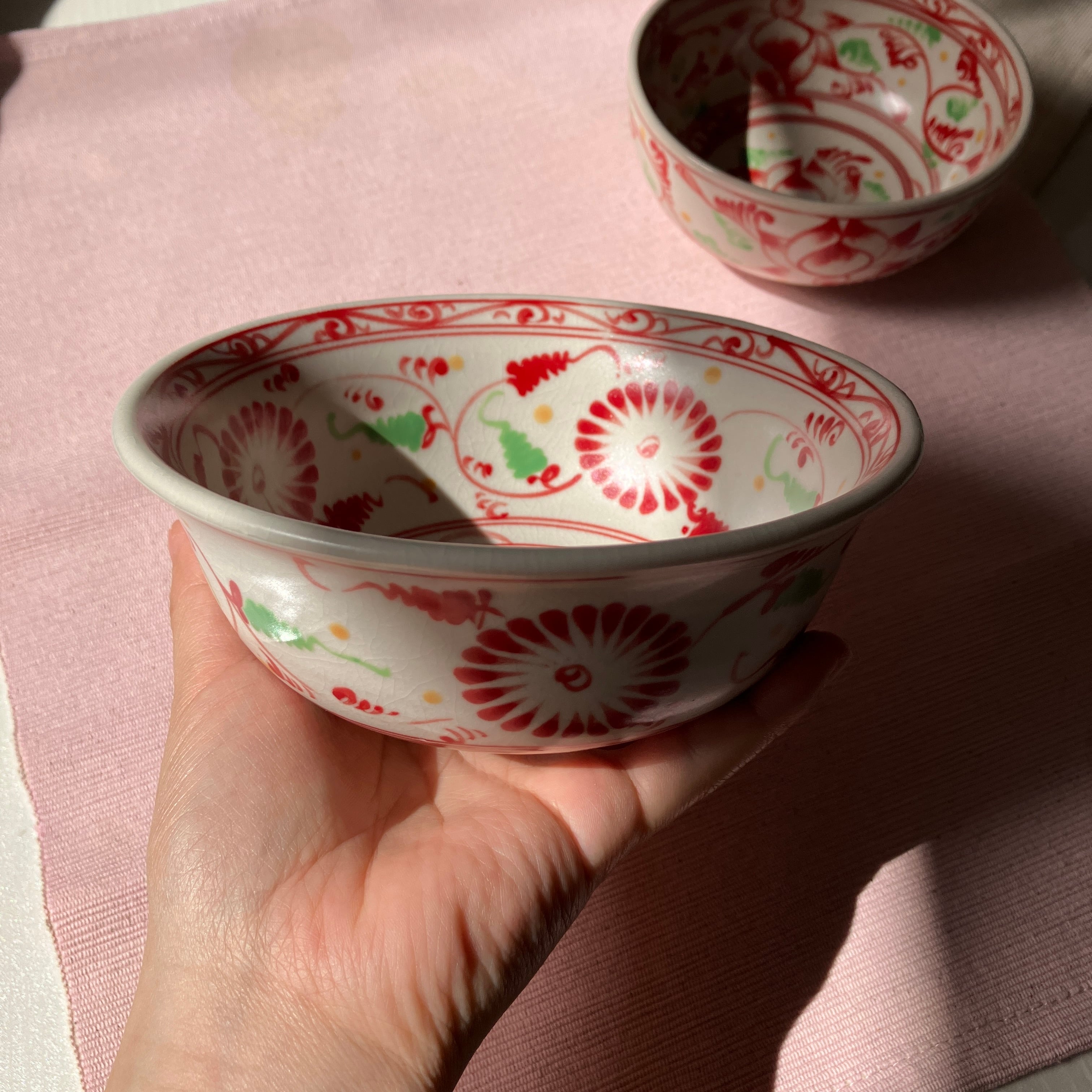 バッチャン焼き定番柄のあかい菊の大きめのお椀です。