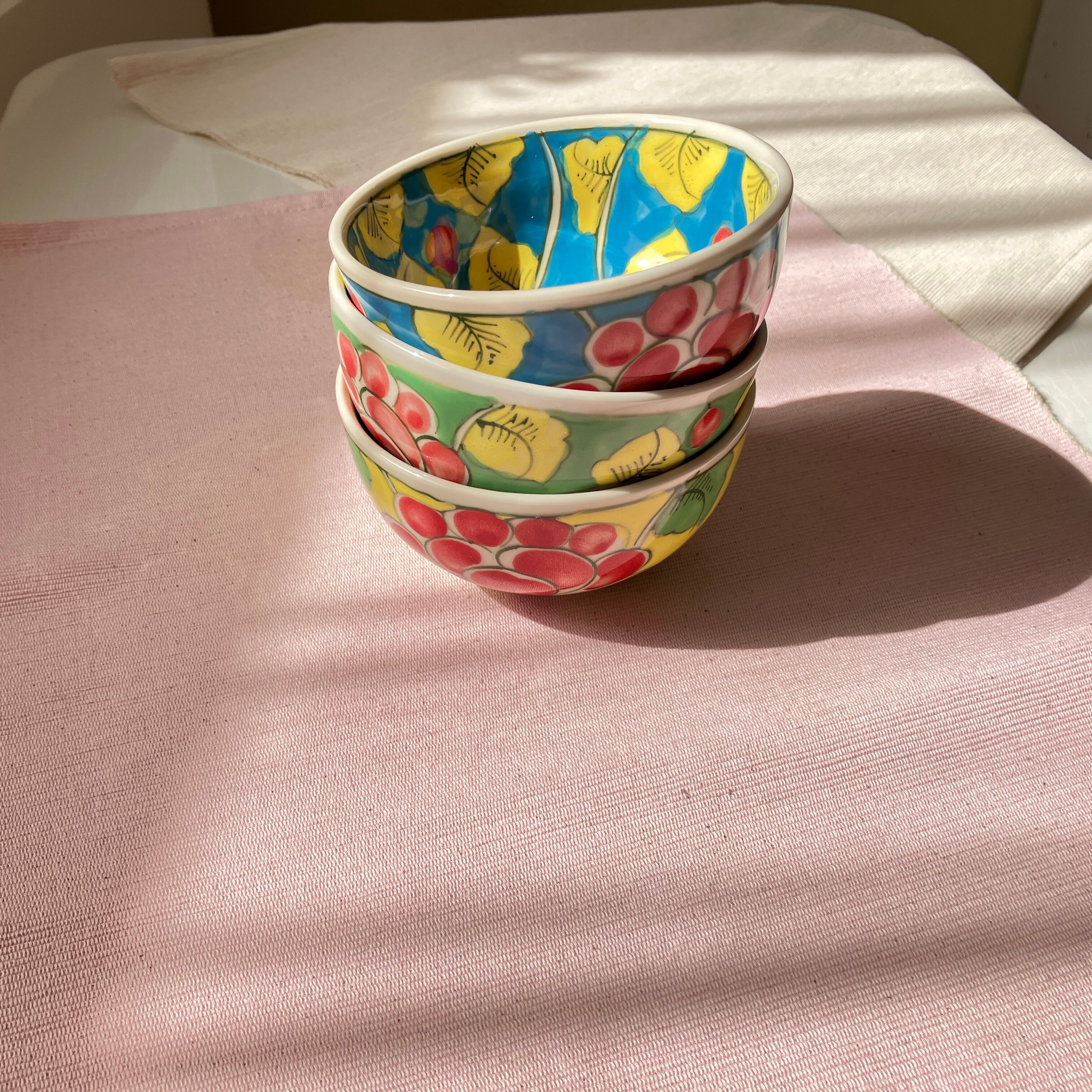 鮮やかなグリーンと赤色で描かれた蓮の絵が可愛いバッチャン焼きのお椀です。